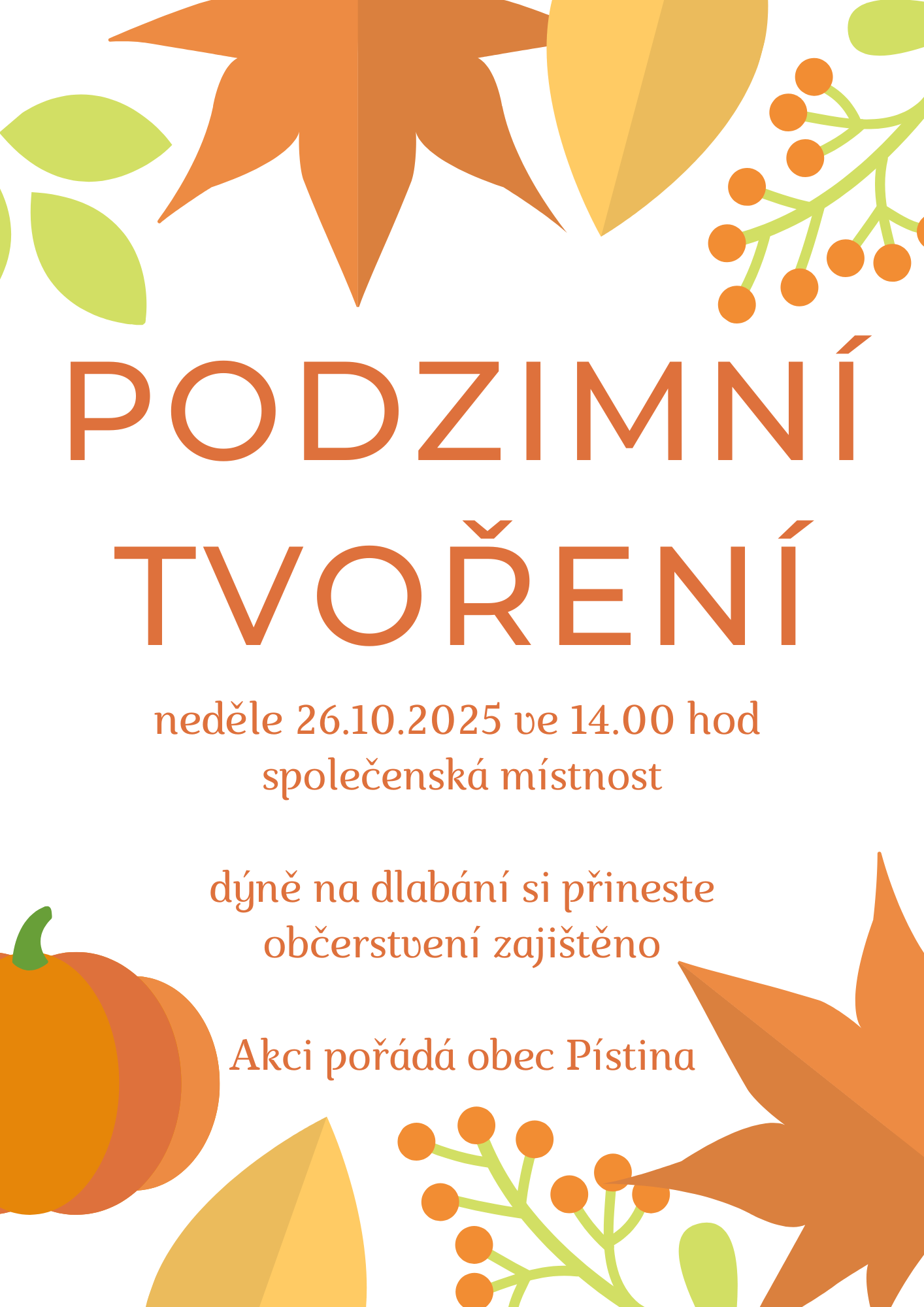 Obec Pístina zve na podzimní tvoření v neděli dne 26.10.2025 ve 14:00 hod. ve společenské místnosti.