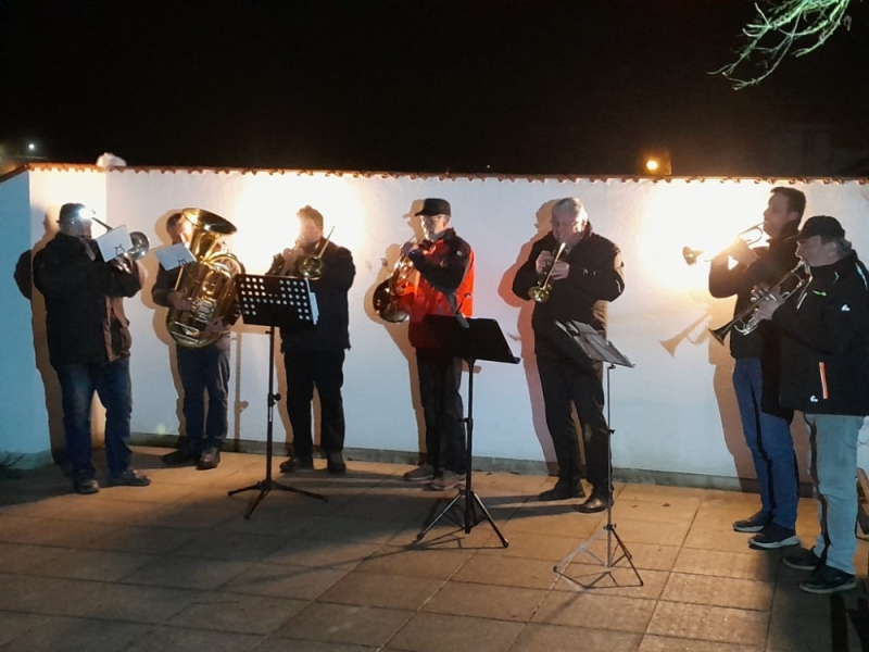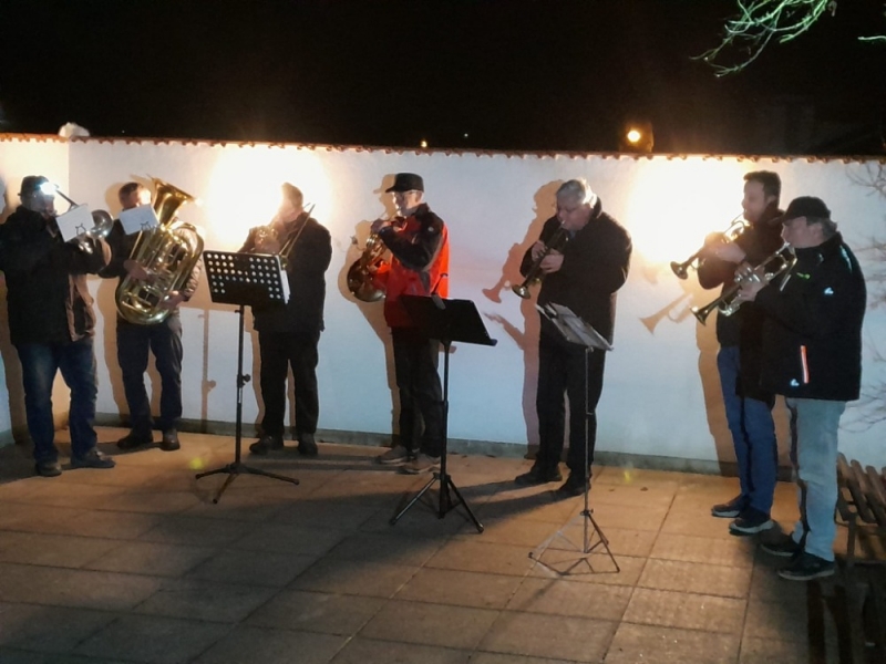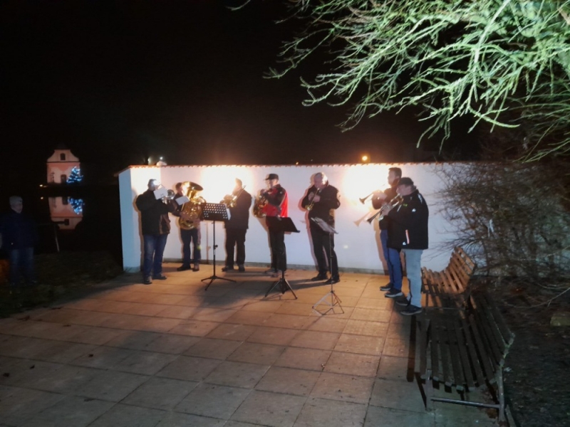 Vánoční troubení u společenské místnosti v podání dechové sekce Třeboňské 12°